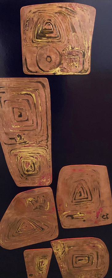 David Rowe chooses to call his unique technique copper collage. It involves cutting out small sized copper sheets, which are delicately engraved, eroded by acids and oven-baked. They are assembled like collage to form intriguing, precious surfaces, carrying implications of ritualistic imagery from ancient, exotic civilisations.
