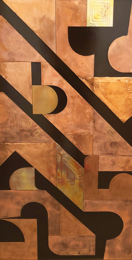 David Rowe chooses to call his unique technique copper collage. It involves cutting out small sized copper sheets, which are delicately engraved, eroded by acids and oven-baked. They are assembled like collage to form intriguing, precious surfaces, carrying implications of ritualistic imagery from ancient, exotic civilisations.